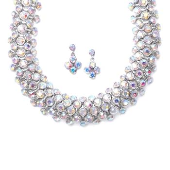 Mariell's bold wedding or pageant necklace and earrings set abounds with sparkling bezel set iridescent crystals in a stylish domed shape. This magnificent Aurora Borealis necklace is adjustable from 16" - 20" and is 1 1/4" w. The matching earrings are 1" h. This silver rhodium set has a coordinating stretch bracelet ML-2006B-AB sold separately.