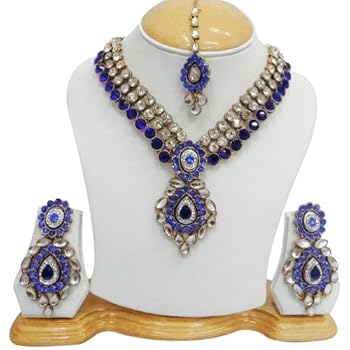 - Iba 3 Pcs Traditional Blue CZ Party Necklace Set Gold Tone Costume Jewelry Wedding Party Wear Bridal Ethnic Sari Jewelry Gift India