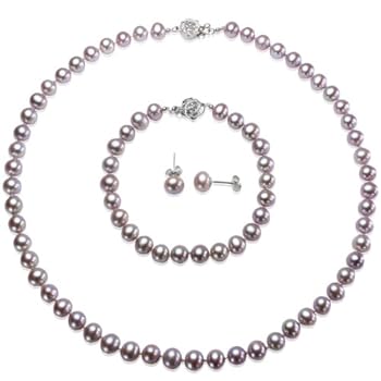 Be classical always with this stunning pearl set! This collection of pearl jewelry is classic in style and is simply pure elegance. The set includes a 16" Natural Lavender 7-8mm Cultured Pearl Choker Necklace, a 7" Natural Lavender 7-8mm Cultured Pearl Bracelet & a pair of 7.5-8mm Natural Lavender Pearl Silver Studs. This set necklace and bracelet are rated AAA or LS1R2. Its luster is rated "AAAA" or "L" meaning excellent luster with sharp reflection; the surface is rated "AAA" or "S1" meaning virtually clean of 95% or better and the shape is rated "AA" or "R2" meaning it is off-round. Each pearl among the necklace and bracelet are carefully selected to be excellently matched. Each pearl is double knotted in between by hand to protect the pearls from rubbing against each other. The clasp is a beautifully carved rose in CAREFREE sterling silver. The earrings are rated AAAA or LS1B. The pearls are button shape with luster that is rated "AAAA" or "L" meaning it has excellent luster with sharp reflection and the surface is rated "AAA" or "S1" meaning it is virtually clean set on our CAREFREE sterling silver post. Our CAREFREE sterling silver is plated with quality Rhodium, the most tarnish resistant and most expensive member of the Platinum metals group. It virtually eliminates the need for frequent cleaning and polishing; increases surface hardness against incidental scratching and abrasion; and adds an expensive platinum look. Beautiful worn together as a set, or can be incredibly versatile and be worn as individual pieces.
