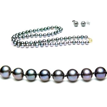 Appraised $700 Freshwater Cultured Black Pearl Necklace and Earrings Set. Wow - The lovely necklace features 6-7mm freshwater cultured black pearls, chosen for their flawless, gleaming luster, round shape and continuity and match. The beads are strung professionally on fine silk then finished with a 14/20 yellow gold-Filled clasp at 18". The Black 6-6.5mm Earrings use the Sterling Silver Mount. The set will come to your home encased in two luxurious leatherette boxes. *** The appraisals on this set are $600 for the necklace and $100 for the earrings - we'll even send you a copy of the appraisal certificates. Please understand that original appraisals from certified appraisers cost between $120 to $150 each in nationwide market. Thus we are not able to send the original appraisals along the order. We'll send you the copy of the appraisal which was done on a same quality pearl necklace and earrings, and for reference purposes only. Because we select our pearls straight from the source, we cut out the middleman and pass the savings on to you. Get the best pearls for less at Augustina Jewelry.